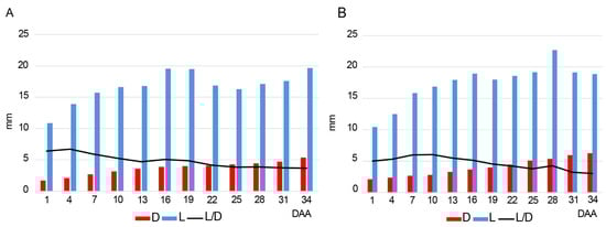 Average values of diameter (D, red color), length (L, blue color), and L/D ratio (line) of the ovaries (in mm) collected between 1 and 34 days after anthesis (DAA). (A) Anacamptis morio; (B) Serapias lingua.