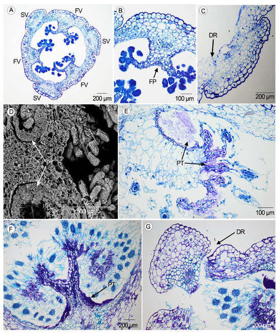 Developmental changes in the ovary in the studied species. (A) Cross-section of the ovary at 1–7 DAA in A. morio (Scale: 200 µm). (B) Detail of a sterile valve and a fertile valve with the forked placenta in A. morio (Scale: 100 µm). (C) Detail of the dehiscence region between sterile and fertile valves at 10–16 DAA in S. lingua (Scale: 200 µm). (D) Cross-section of the ovary at 19 DAA showing the large number of pollen tubes in A. morio under scanning electron microscope (Scale: 500 µm). (E) Cross-section at 19 DAA (black arrows indicate the pollen tubes and their extensions) in A. morio (Scale: 100 µm). (F) Detail of the forked placenta with the remnants of the pollen tube at 28 DAA in S. lingua (Scale: 200 µm). (G) Dehiscence of the fruit and detached sterile valve at 31–34 DAA in S. lingua (Scale: 200 µm). (SV—sterile valve, FV—fertile valve, FP—forked placenta, DR—dehiscence region, PT—pollen tube).