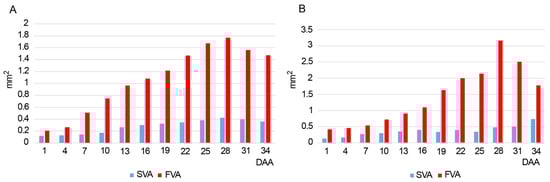 Average values of the sterile valve area (SVA) and fertile valve area (FVA) of the ovaries (in mm2) collected between 1 and 34 days after anthesis (DAA). (A) Anacamptis morio; (B) Serapias lingua.