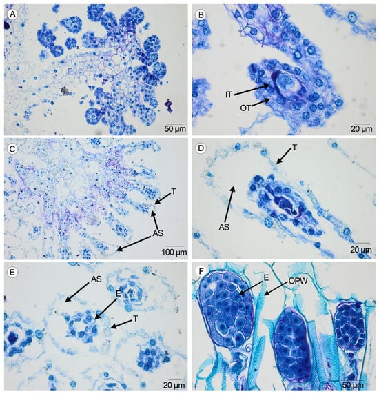 Developmental changes in the ovules and seeds in the studied species. (A) Globose ovules at 1–7 DAA in A. morio (Scale: 50 µm). (B) Bitegmic and anatropous ovule at 10–16 DAA in A. morio (Scale: 20 µm). (C) Cross-section of the fertile valve with immature seeds in S. lingua (Scale: 100 µm). (D) Longitudinal section of one immature seed at 19–28 DAA in S. lingua (Scale: 20 µm). (E) Cross-section of one immature seed at 19–28 DAA in S. lingua (Scale: 20 µm). (F) Longitudinal section of the seed with the multicellular embryo and the periclinal walls of the testa provided with ornamentation in S. lingua (Scale: 50 µm). (OT—outer tegument, IT—inner tegument, T—testa, AS—air space, E—embryo, OPW—ornamentation of the periclinal walls).