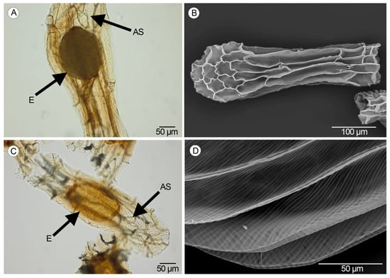 Mature seeds. (A) Seed of Anacamptis morio with the translucent testa and the internal free air space surrounding the embryo under light microscope (LM) (Scale: 50 µm). (B) Scanning electron micrograph of the seed with thin anticlinal walls and visible periclinal walls in A. morio (Scale: 100 µm). (C) Seed of Serapias lingua with the air space surrounding the embryo under LM (Scale: 50 µm). (D) Scanning electron micrograph showing the ornamentation pattern of the periclinal walls (slanting ridges) along the medial cells in the seeds of S. lingua (Scale: 50 µm). (AS—air space, E—embryo).