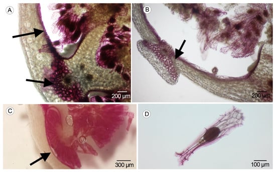 Phloroglucinol staining and lignification. (A) Cross-section of the mature ovary in Serapias lingua (black arrows indicate lignification in the vascular bundles and the external layer of the placenta) (Scale: 200 µm). (B) Cross-section of the mature ovary in S. lingua (black arrows show the dehiscence region) (Scale: 200 µm). (C) Cross-section of the ovary in Anacamptis morio (black arrow indicates the presence of lignin in the external later of the placenta) (Scale: 300 µm). (D) Mature seed of S. lingua with stained anticlinal and periclinal walls (Scale: 100 µm). In all the subfigures, the presence of lignin is stained purple with the phloroglucinol.