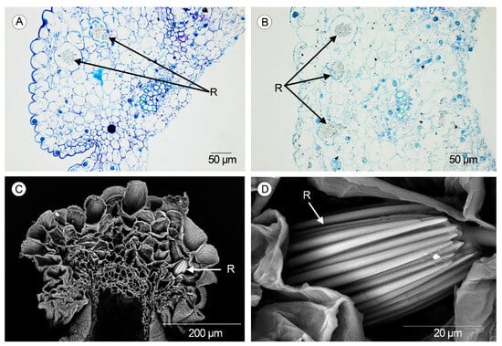 Raphides. (A) Idioblasts at the sterile valve in Anacamptis morio (Scale: 50 µm). (B) Idioblasts at the sterile and fertile valves in Serapias lingua (Scale: 50 µm). (C) Scanning electron micrograph of the cross-section of a sterile valve showing the raphides in S. lingua (Scale: 200 µm). (D) Scanning electron micrograph of the raphides formed by packed needles in S. lingua (Scale: 20 µm). (R—raphides).