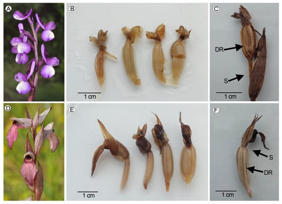 Anacamptis morio: (A) Inflorescence. (B) Ovaries collected at 4, 10, 19, and 25 DAA. (C) Dehiscent fruit and seeds collected at 34 DAA. Serapias lingua: (D) Inflorescence. (E) Ovaries collected at 4, 10, 19, and 25 DAA. (F) Dehiscent fruit and seeds collected at 34 DAA. (DR—dehiscence region, S—seeds).