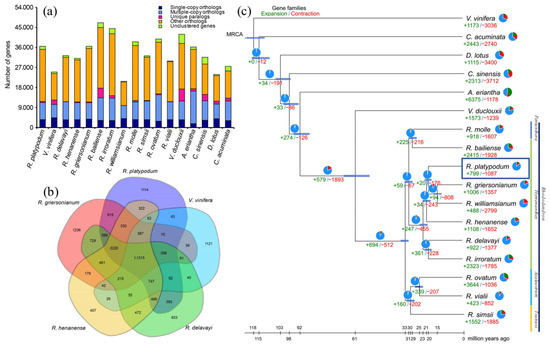 (a) Bar graph showing the species-specific or nonspecific properties of all genes in 17 species. (b) The Venn diagram shows the distribution of shared or unique orthogroups among five Rhododendron species. (c) Phylogenetic tree showing the topology and divergence times for 19 plant species. Divergence times are indicated by light blue bars at the internodes. The range of the light blue bars indicates the 95% highest posterior density of the divergence time. Numbers in green and red at branches indicate the expansion and contraction of gene families, respectively. The pie chart colors represent the changes in gene families (blue—no significant change; orange—expanded or contracted; green—expanded; red—contracted); each color sector illustrates the proportion of each type of gene family change. Note: refer to Table S6 for the standardized abbreviations of plant species names.