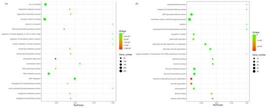 The expanded and contracted gene families of R. platypodum were annotated by Gene Ontology (GO). Among the expanded gene families (Figure 2a), the most enriched categories in the molecular function category were binding (839) and catalytic activity (804) (Figure S4a). The most abundant terms included transition metal ion binding, zinc ion binding, DNA metabolic process, and DNA integration (p < 0.05). Within the contracted gene families (Figure 2b), the molecular function category showed the highest enrichment for catalytic activity (171), and the Cellular Component category showed the highest enrichment for membrane (141) (Figure S4b). The most significant terms included flavonoid metabolic process, flavonoid biosynthetic process, transferase activity, transferring glycosyl groups, and UDP-glycosyltransferase activity.