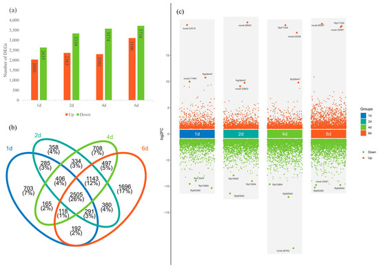 (a) The number of upregulated or downregulated DEGs in different treatment groups in R. platypodum. (b) The number of shared or unique DEGs across different treatment groups. (c) Volcano plots of DEGs in treatment groups.