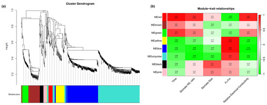 Differentially expressed genes (DEGs) with a coefficient of variation (CV) > 0.5 were used to generate co-expression network modules through weighted gene co-expression network analysis (WGCNA) in R [20]. The co-expression modules were identified using the automatic network construction function (blockwiseModules) with default parameters, except for a soft threshold power of 18, TOMtype set to “signed”, mergeCutHeight set to 0.25, and minModuleSize set to 100 [96]. Initial clusters were merged based on eigengenes. The eigengene value for each module was calculated and used to explore associations with the heat stress time, stomatal W/L ratio, stomatal size, Fv/Fm, and relative conductivity. The networks were visualized using Cytoscape (v.3.7.2, USA) [97].