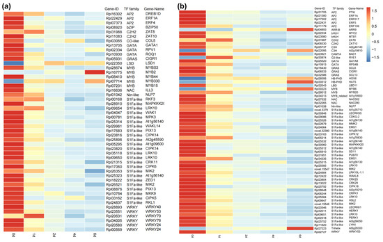 The expression levels of transcription factors and their corresponding gene families in the two modules. (a) Blue module; (b) turquoise module.