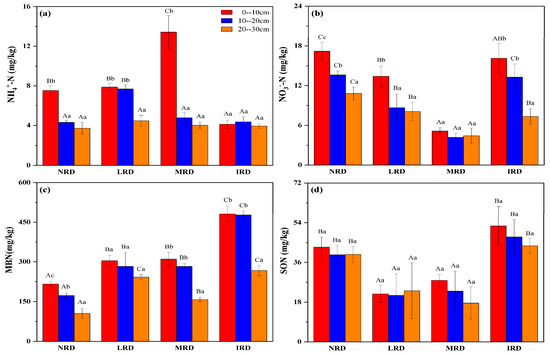 Characteristics of soil active nitrogen in the humid monsoon climate zone, with NH4+-N concentration (a), NO3-N concentration (b), MBN concentration (c) and SON concentration (d). Capital letters (A, B, C) indicate significant differences among the four grades of rocky desertification, while lowercase letters (a, b, c) indicate significant differences within the soil layers (A, B, and C). Figure shows soil ammonium nitrogen (NH4+-N), nitrate nitrogen (NH3-N) concentrations, soil microbial biomass nitrogen (MBN), and soil organic nitrogen (SON) across three soil layers in humid monsoon climate zones among the four grades of desertification; non-rocky desertification (NRD), light rocky desertification (LRD), moderate rocky desertification (MRD), and intense rocky desertification (IRD). Capital letters (A, B, C) indicate significant differences among the four levels of rocky desertification, while lower-case letters (a, b, c) indicate significant differences within the soil layers (A, B, and C).