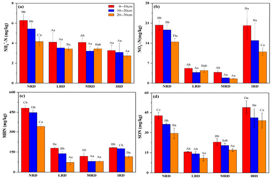 The data revealed significant differences in soil active nitrogen dynamics between the dry-hot valley and humid monsoon climate zones (Figure 1 and Figure 2). In the dry-hot valley, N components were highest in the IRD grade, whereas in the humid monsoon zone, the NRD grade consistently showed higher concentrations. These results indicated that the influence of rocky desertification on soil active nitrogen is climate dependent, with distinct patterns observed in arid versus humid regions. Figure 1 illustrated the distribution of soil active nitrogen components across different grades of rocky desertification (NRD, LRD, MRD, and IRD) and soil depths (0–10 cm, 10–20 cm, and 20–30 cm) in the dry-hot valley climate zone. Soil NH4+-N concentrations showed significant variation among rocky desertification grades (p < 0.05). NH4+-N levels were highest in the surface layer (0–10 cm) for all grades, with IRD exhibiting the greatest concentration (12 mg/kg) compared to lower concentrations in MRD, LRD, and NRD. Within each soil layer, NH4+-N levels decreased with increasing depth, with IRD consistently displaying the highest concentrations across all depths (Figure 1a). Soil NO3−-N concentrations followed a similar trend, with significant differences observed among desertification grades. IRD demonstrated the highest NO3−-N levels (18 mg/kg) in the 0–10 cm layer, significantly surpassing the concentrations in the MRD, LRD, and NRD categories. NO3−-N concentrations also declined with depth, and IRD maintained the highest levels across all layers (Figure 1b). Microbial biomass nitrogen (MBN) was markedly higher in IRD than in other desertification grades, particularly in the 0–10 cm layer (450 mg/kg). MBN concentrations were significantly lower in MRD, LRD, and NRD, with values decreasing progressively with depth (Figure 1c). Soil organic nitrogen (SON) also exhibited significant differences across rocky desertification grades, with the highest concentrations observed in IRD (54 mg/kg in the surface layer). SON levels were consistently lower in deeper soil layers across all desertification grades (Figure 1d).