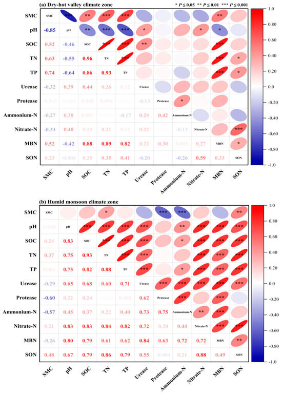 Relationships between soil physicochemical properties and active nitrogen fractions in the two regions. The dry-hot valley climate zone (a) and the humid monsoon climate zone (b). Statistical significance is indicated as follows: *** p < 0.001, ** p < 0.01, and * p < 0.05.