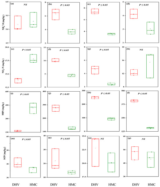 The comparative analysis of soil active nitrogen fractions across different rocky desertification grades in the humid monsoon climate and the dry-hot valley climate region, with NH4+-N concentration in NRD (a), LRD (b), MRD (c) and IRD (d), NO3-N concentration in NRD (e), LRD (f), MRD (g) and IRD (h), MBN concentration in NRD (i), LRD (j), MRD (k) and IRD (l) and SON concentration in NRD (m), LRD (n), MRD (o) and IRD (p). Values with p ≤ 0.05 indicate significant difference, while NS indicates no significant difference (Wilcoxon signed-rank). DHV and HMC represent the dry-hot valley climate region and the humid monsoon climate region, respectively.