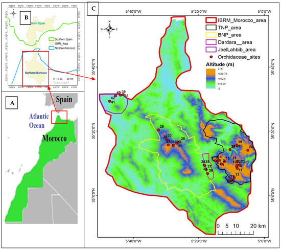 Map of the Intercontinental Biosphere Reserve of the Mediterranean (IBRM) shared between Spain and Morocco (A) showing the localization of the Moroccan study area (B) and the investigated sites in the Moroccan part of the IBRM (C), including four distinct protected areas, namely the Talassemtane National Park (TNP: sites 1–24), the Bouhachem Natural Park (BNP: sites 25–32), the Dardara area (sites 33–37), and the Jbel Lahbib Reserve (sites 38–42).