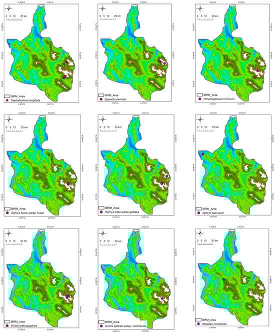 This floristic inventory reports the taxonomic identification of 21 Orchidaceae taxa (species and subspecies) or 26 taxa according to the African Plant Database (APD) [46] in the studied area (see Supplementary Materials Appendix S1), which belong to seven genera (Cephalanthera, Epipactis, Himantoglossum, Limodorum, Ophrys, Orchis, and Serapias). In total, nine orchid taxa were recorded in only one of the four areas studied (Figure 2), ten taxa were found in two of the studied protected areas (Figure 3), and only Serapias lingua L. subsp. lingua and S. parviflora Parl. were found in three or all the studied areas (Figure 4), respectively.