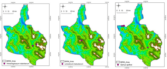 Although most of the recorded Orchidaceae in the studied part of the IBRM were assessed herein as threatened by human activities, special attention and priority should be given to those of calcareous substrates occurring from lowlands to intermediate altitudes due to their proximity to human agglomerations and expansive urbanization. Orchids of such habitats may have a high rate of rapid decline, as reported by previous studies [51] for similar cases in Estonia and the UK or by others [41] in Serbia. However, our study showed that the limestone fir and holm oak forests in intermediate altitudes of the Talassemtane National Park were also highly influenced by human activities, namely the abstraction of surface water, forest fires, and Cannabis farming. These areas represent the only occurrences of Orchis spitzelii subsp. cazorlensis reported herein for the first time in Morocco. Therefore, orchid populations of calcareous habitats in the study area could diminish gradually in the coming years unless in situ conservation measures are quickly implemented.