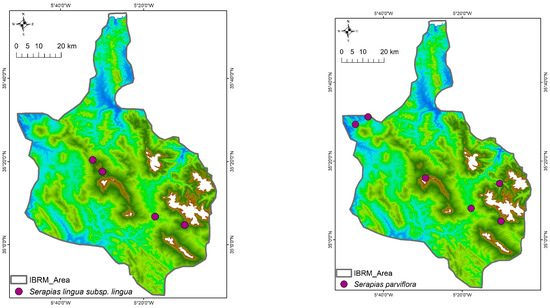 Globally, the family Orchidaceae has been protected since 1975 by the Convention on International Trade in Endangered Species of Wild Fauna and Flora (CITES) Appendices I and II [23]. However, according to the International Union for Conservation of Nature (IUCN) Red List [22], only 271, 479, 245, and 108 taxa of Orchidaceae are assessed as Critically Endangered (CR), Endangered (EN), Vulnerable (VU) and Near Threatened (NT), respectively, while six taxa are considered Extinct (Ex). Regionally, 20 orchids of Spain are included in the IUCN Red List, including one threatened (EN) and three Near Threatened (NT) taxa; in contrast, however, only 13 taxa are included in the IUCN Red List, and seven taxa are assessed as threatened in North Africa. In Morocco, only three taxa, namely Dactylorhiza maurusia (Emb. & Maire) Holub (EN), Dactylorhiza elata (Poir.) Soó (NT), and Platanthera algeriensis Batt. & Trab. (NT) are assessed as threatened [22,23]. The latter two orchid species share the same threat categories in Morocco and Spain. Following global trends, the Orchidaceae members in Morocco have been recently designated with a special protection status governed by the National Law No. 29-05 of 2011 on the protection of species of wild fauna and flora and their trade [24]. Given that the legally protected areas, such as nature reserves and parks, could constitute an effective tool for the in situ conservation of globally threatened biological resources, Morocco has designated four biosphere reserves, ten national parks, and one natural park to protect its biodiversity in situ [25].