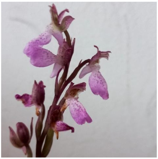 Despite the fact that Orchis spitzelii subsp. cazorlensis [=Orchis cazorlensis] has been reported as an endemic taxon of the Iberian Peninsula [50] and has been assessed as having a doubtful presence in Morocco according to [31], the study herein confirmed the presence of this species in the Talassemtane National Park of Morocco, albeit with only a few individuals (n = 13), thus delivering a first documented report substantiated with herbarium material and ecological observations. This species is characterized by a large, short, and broadly open spur, olive-green to reddish-brown sepals outside, a lip that is not very convex and rather spreading, and a spur ca. half the length of the lip [6].