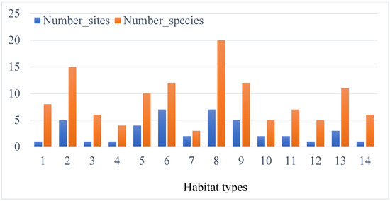 Richness of non-Orchidaceae vascular plants per habitat type in the Moroccan part of the International Biosphere Reserve of the Mediterranean. Habitat types: 1. Chamaephyte-rich with Chamaerops humilis and Stachys fontqueri; 2. Coniferous rainforest with forest Abies pinsapo subsp. marocana; 3. Matorral with Pistacia atlantica, Olea europaea subsp. europaea and Chamaerops humilis; 4. Matorral with Pistacia lentiscus and Chamaerops humilis; 5. Matorral with Pistacia lentiscus, Myrtus communis, and Olea europaea subsp. europaea; 6. Matorral with Quercus ilex; 7. Pelouses with Asteraceae, Boraginaceae, and Poaceae members; 8. Rainforest with Quercus ilex and Cistus spp.; 9. Rainforest with Quercus suber, Pistasia lentiscus, and Myrtus communis; 10. Rainforest degraded on siliceous substrate with Pteridium aquilinum; 11. Rainforest on siliceous substrate with Quercus canariensis, Quercus lusitanica, and Quercus pyrenaica; 12. Rainforest on siliceous substrate with Quercus pyrenaica and Quercus suber; 13. Rainforest on siliceous substrate with Quercus suber and Quercus pyrenaica; 14. Rainforest with Quercus ilex and Quercus faginea.