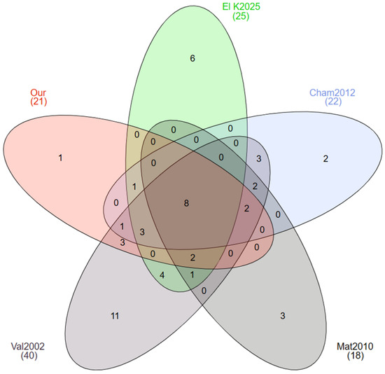 Venn diagram showing the number of common and non-common orchid taxa (species and subspecies) between the current (our) and previous studies in the Rif region, Morocco. Sources: Val2002-[30]; Mat2010-[28]; Cham2012-[27]; El K2025-[14].