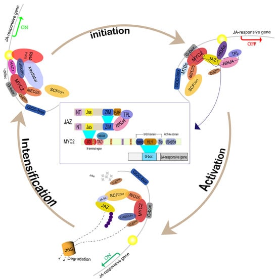 Regulation of the jasmonate signaling pathway by MYC2 transcription factors. The dynamic regulation of the JA signaling pathway, mediated by MYC2 transcription factors across various stages, depicts the complex interactions among key components, including MYC2, MED25, and JAZ proteins. Initialization: Interaction between MYC2 and JAZ proteins, which are characterized by NT, Jas, ZIM, and EAR domains. At this stage, JAZ proteins exert repressive functions through interactions with NINJA and TPL, effectively inhibiting MYC2 activity. Activation: Following stimulation by JA-Ile, MYC2 is released from JAZ-mediated repression. The F-box protein COI1 targets JAZ proteins for degradation, liberating MYC2 from inhibition. Subsequently, MYC2 forms a complex with MED25, recruiting RNA polymerase II and other co-activators such as HAC1 to initiate transcription of JA-responsive genes. Intensification: MED25 facilitates the recruitment of RNA Polymerase II to promoters of JA-responsive genes, supported by MYC2 binding to G-box elements. Additionally, transcription is further enhanced by the modulation of chromatin structure, specifically through acetylation of Histone 3 Lysine 9 (H3K9ac), to enable more efficient transcription. The yellow circle indicates a chromatin-associated protein complex binding site where key transcriptional regulators converge at JA-responsive promoters to mediate dynamic chromatin remodeling and gene activation or repression.