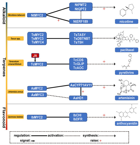 MYC2 regulates the biosynthesis of plant secondary metabolites. NtMYC2 controls nicotine biosynthesis in N. tabacum by regulating NtPMT2, NtQPT2, and NtERF189. TsMYC2/3/4 modulates paclitaxel biosynthesis in Taxus spp. TcMYC2, activated by JA signaling, regulates TcCDS, TcGLIP, and TcAOC to drive pyrethrin synthesis in Tanacetum cinerariifolium. AaMYC2 and AaMYC3 regulate artemisinin biosynthesis in Artemisia annua via AaCYP71AV1 and AaHD1. IbMYC2 in Ipomoea batatas promotes anthocyanidin biosynthesis through IbCHI and IbDFR.
