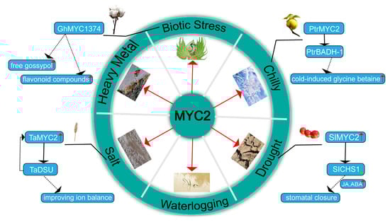MYC2 plays a significant role in regulating the synthesis of plant secondary metabolites and acts as a key regulator in plant responses to abiotic stresses. It activates downstream stress-responsive genes, enhancing plant adaptation to cold, drought, salinity, and other adverse conditions. An overview of MYC2-mediated stress response pathways is illustrated in Figure 3.