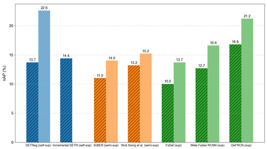 Comparison of pre-training methods in few-shot object detection. The blue, orange, and green columns represent self-supervised, semi-supervised, and supervised methods, respectively. Dark and diagonal represent 10-shot scenarios, and light colors represent 30-shot scenarios. All data are from the original literature.