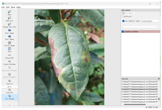 To ensure the applicability of the model in the actual agricultural production environment, the data in the dataset are all real scene images with diseased leaves as the main body and a complex field background. The collection of tea disease data was carried out at the end of spring and the beginning of summer, which is the incidence period of tea diseases. The image acquisition equipment has a macro camera with 2 million pixels. In order to ensure the clarity of the image, the image acquisition work was carried out on sunny days with sufficient light. The distance between the camera and the leaves is about 5–10 cm to ensure the complete presentation of the leaf, a clear leaf outline, and an obvious disease infection area. Figure 2 presents the tea data samples and Figure 3 is the annotation process. It is worth noting that in actual agricultural production, farmers often take immediate action to remove when they find diseased leaves, resulting in the scarcity of tea disease samples. To this end, this study innovatively constructs a hybrid data strategy. On the basis of independently collecting high-quality field samples, open-source disease image resources on the Internet are integrated. This method has two advantages: Firstly, it improves the richness and diversity of the data. Secondly, using the fine-tuning strategy in transfer learning, the model can be pre-trained on a large-scale online leaf disease dataset to learn general features and then realize few-shot tea disease detection through subsequent fine-tuning. Therefore, based on cotton disease categories as the basic class , tea disease types are novel classes . The distribution of the original dataset is shown in Table 1.