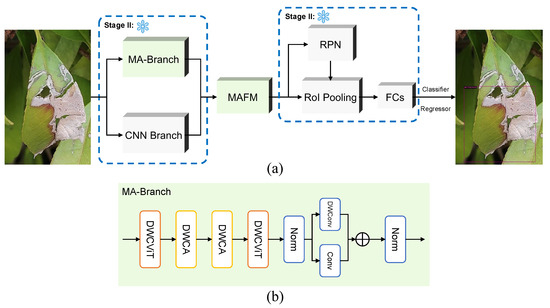 Overview of the proposed method: (a) Architecture of the MAF-MixNet model. The right picture of the tea leaf shows the detection result; (b) Structure of the Mixed Attention Branch (MA-Branch). In the stage two, we only fine-tune the MAFM and heads, remaining the other modules frozen.