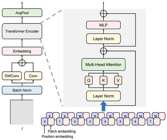 denotes batch normalization. represents a depth-wise separable convolution, composed of a depth-wise convolution followed by a pointwise convolution. Subsequently, following the original Vision Transformer architecture, the feature map is divided into image patches. These patches are then flattened and projected to produce the patch embedding sequence , where (number of patches) and (embedding dimension per patch). To preserve spatial positional information, a learnable positional encoding is introduced and added to the image embeddings. Finally, the position-augmented embedding sequence is fed into a transformer encoder composed of a multi-head self-attention mechanism and feed-forward network, enabling global feature extraction and semantic information acquisition. The encoder output sequence is reshaped back into a 2D feature map format for downstream modules. The core computation of this process can be formulated as follows: