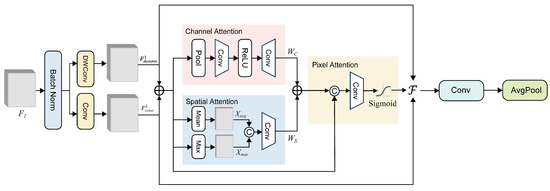 denotes the global average pooling, represents the convolutional weights, is the bias term, and similarly for and . represents the result of taking the mean along the channel dimension, while denotes the result of taking the maximum value along the channel dimension. denotes channel-wise concatenation. and represent the convolutional weights and biases, respectively. The fused attention weights, which incorporate both spatial positional information and channel-wise information, are obtained by summing the weight matrices. This hybrid weight matrix is then concatenated with the previously obtained fused feature map after dimensionality expansion. This process generates a new feature representation that preserves foundational feature information while enhancing critical features. The weight is derived through convolutional operations and a Sigmoid activation function. The entire pixel attention module generates these more refined feature weights that further improve the feature extraction ability. Finally, the resultant features are obtained via the function, followed by convolution and average pooling operations.