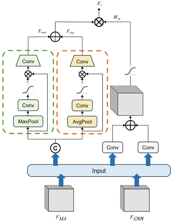 The MAFM receives feature maps from the MA-Branch and CNN Branch, denoted as and , with dimensions and , respectively, where and . In the first pathway, apply a convolution followed by a Sigmoid activation function to each input feature map, generating spatial attention weights to highlight salient regions. The convolutions project the channel dimension to 1, indicating we only focus on the spatial dimensions. After using traditional additive fusion, the activation function is used to extract the important position weights in space.