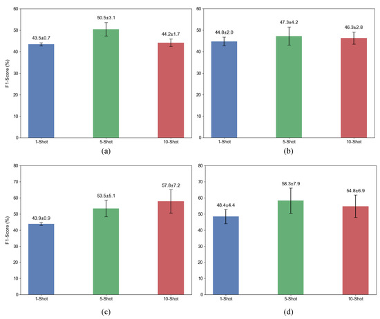 Mean F1 score and standard deviation for the four ablation experiment groups. (a) corresponds to the baseline model, (b) is the baseline model with MA-Branch added, (c) is the baseline model with MAFM added, and (d) is our proposed model.