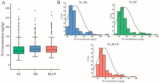 Distribution of Ni content in the panel of association population under different environments: (A) Boxplot of Ni grain content in SQ, KF, plus the BLUP of all the environments; (B) distribution of the Ni content in the association populations from KF, SQ, and BLUP.