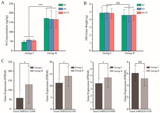 Analysis of the global gene expression in high- and low-Ni individual lines: (A) Ni concentrations in wheat grains of high-Ni and low-Ni groups; Group I contains 15 individual lines with high Ni concentration, and Group II contains 15 individual lines with low Ni concentration. (B) There is no significant difference in the 100-grain weight between Group I and Group II in different environments. (C) Analysis of the differences in the expression levels of candidate genes between Group I and Group II. * and *** indicate that the expression levels of the candidate genes are significantly different between the two groups (* indicates p-value < 0.05 and *** indicates p-value < 0.001), and NS indicates that there is no difference in the expression levels of the candidate genes between the two groups.