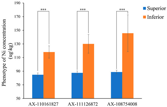 The phenotypic performance of cultivars with superior and inferior alleles at three repetitive significantly associated SNP loci for grain Ni content. The blue bars denote the phenotype values of superior alleles, while the brown bars represent the phenotype values of inferior alleles. The figure was generated using BLUP values, with *** indicating a p-value < 0.0001 and the error bars in the figure representing the standard error (SE).