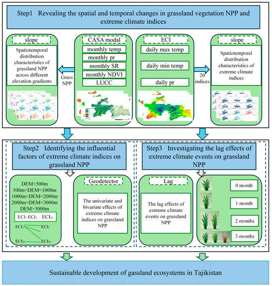 In this study, we utilized meteorological data with grassland vegetation net primary productivity (NPP) to investigate the impacts of seasonal extreme climate events on grassland vegetation NPP across various altitudinal bands in Tajikistan, focusing on lagging responses. Our specific objectives were as follows: (1) to evaluate the spatiotemporal distribution patterns of alpine grassland vegetation NPP and extreme climate indices in Tajikistan; (2) to identify the single-factor and dual-factor interactions of extreme climate indices influencing grassland vegetation NPP dynamics; and (3) to analyze the lag time of the effects of extreme climate indices on grassland NPP in Tajikistan. Therefore, this study is of great significance for understanding the mechanisms of vegetation response to seasonal extreme climate events and for providing scientific guidance in ecosystem management and sustainable development in the region.