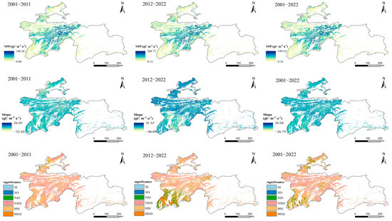 The annual average grassland NPP in Tajikistan over the past 22 years followed an uneven distribution. High-value areas were primarily located in the central and the northern parts of the Khatlon region, with most grassland NPP exceeding 70 gC/(m2·a) and with a few areas exceeding 150 gC/(m2·a). Low-value areas were mainly found in the southern parts of Khatlon and the plateau and gully regions of the Gorno-Badakhshan Autonomous Region. The regions that experienced a significant increase in grassland NPP from 2001 to 2022 were primarily concentrated in the southwestern and northern plain areas, with sporadic zones showing non-significant increases. The most significant increases were found in the high-altitude central regions. Specifically, between 2001 and 2011, the grassland NPP in Tajikistan generally showed either a very significant increase or a non-significant decrease, with a few non-significant increase trends scattered in the central mountainous regions. In contrast, the spatial pattern of NPP change became more complex from 2012 to 2022, with the southwestern low-altitude areas showing very significant decreases and non-significant increases, while the northern low-altitude areas predominantly showed very significant increases (Figure 4).