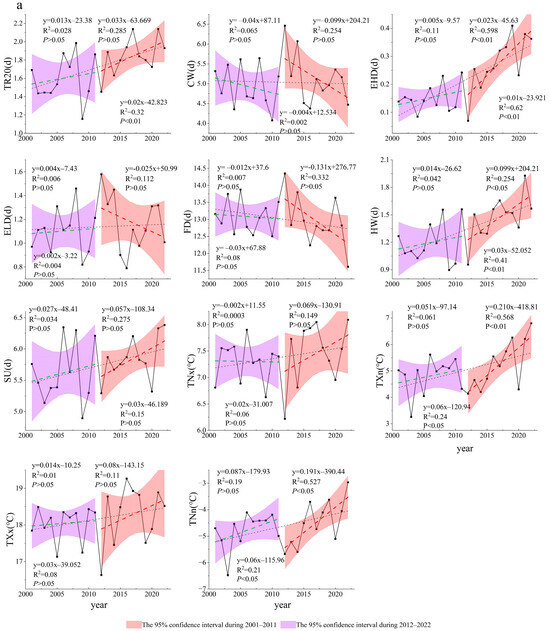 Changes in annual extreme temperature indices (a) and extreme precipitation indices (b) during 2001 to 2022. Green line, the grassland NPP change trend from 2001 to 2011; red line, the grassland NPP change trend from 2012 to 2022; black line, the grassland NPP change trend from 2001 to 2022.