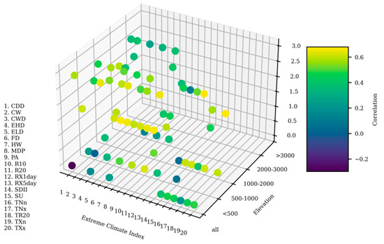 Using the coefficient of variation (CV) to analyze the spatial variability of extreme climate indices in Tajikistan (Figure 6), we found that extreme temperature indices (CW, FD, and ELD) exhibited significant fluctuation in areas below 1000 m in elevation, with CV values exceeding 0.2. This indicates that extreme temperature variations are more pronounced in low-altitude regions. In contrast, these indices showed much smaller variability in mid- to high-altitude areas, with CV values typically below 0.1, which suggests a more stable climate in these regions.