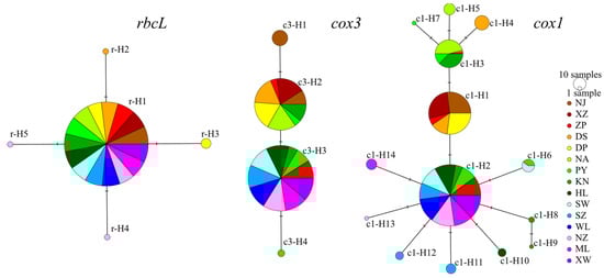 Median-joining network based on rbcL, cox3 and cox1 haplotypes. The size of circle is proportional to haplotype frequency. The one short bar on the connecting line represents one mutation step.