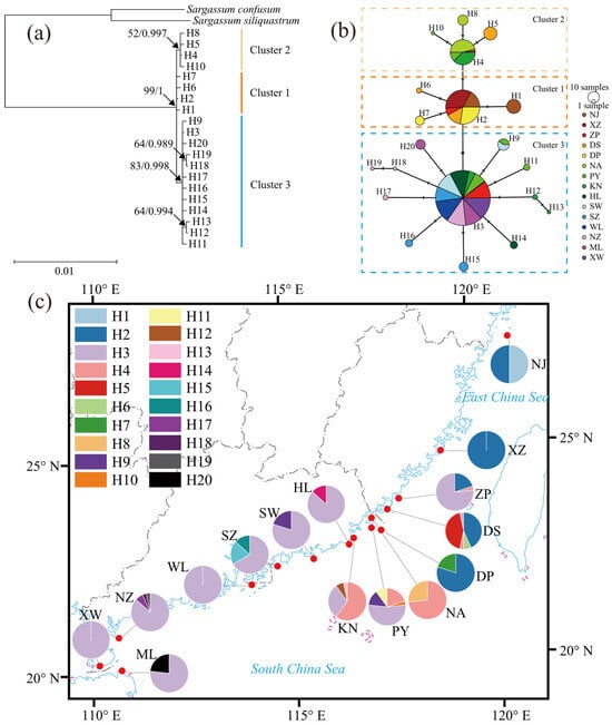Using the best nucleotide substitution model, the HKY model, ML and BI phylogenetic trees were constructed based on the concatenated cox3–cox1–rbcL sequences. The 20 haplotypes were divided into three clusters in the phylogenetic tree (Figure 2a). Specifically, Cluster 1 consisted of haplotypes H1, H2, H6, and H7; Cluster 2 included haplotypes H4, H5, H8, and H10; and Cluster 3 comprised the 12 remaining haplotypes. The median-joining network (Figure 2b) revealed that the 20 haplotypes formed three star-like structures, with haplotypes H2, H4, and H3 at the centers, each radiating multiple derived haplotypes. Haplotypes H1, H6, and H7 were clustered around H2; haplotypes H5, H8, and H10 were clustered around H4; and the remaining 11 haplotypes were clustered around H3. The distance between H2 and H3 was two mutational steps, while all other adjacent haplotypes were separated by a single mutational step. The structure of the haplotype network corresponded to the phylogenetic tree, with the star-like structures in the network forming the three clusters. Cluster 2 was connected to Cluster 3 through Cluster 1. In the phylogenetic tree and haplotype network, Cluster 1 was distributed across five populations, ranging from Nanji (NJ) to Dingpeng (DP); Cluster 2 was found in five populations in the southern Fujian–eastern Guangdong region, including Zhangpu (ZP), Dongshan (DS), Nan’ao (NA), Pingyu (PY), and Keniaowei (KN); and Cluster 3 was distributed in 11 populations south of Zhangpu (ZP), excluding Dingpeng (DP) and Nan’ao (NA). The Zhangpu (ZP) and Dongshan (DS) populations contained haplotypes belonging to all three clusters, while the Pingyu (PY) and Keniaowei (KN) populations contained haplotypes from Cluster 2 and Cluster 3. The 11 remaining populations each contained haplotypes exclusively from a single cluster (Figure 2b,c).