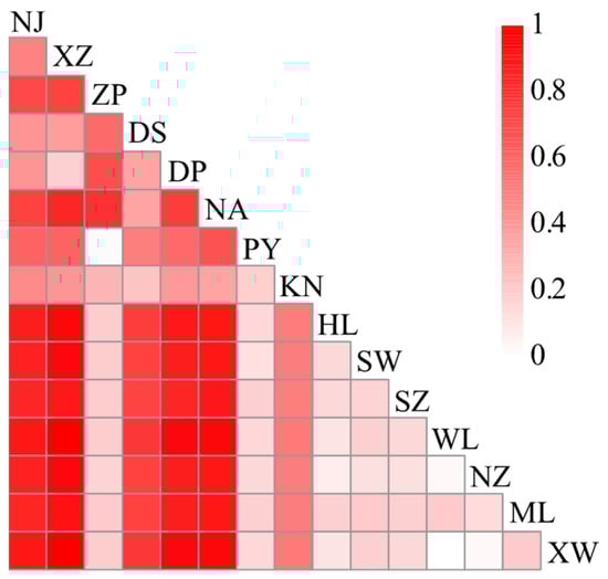 Based on the concatenated cox3–cox1–rbcL sequence data, the pairwise genetic distances between populations ranged from 0 to 9.499 × 10⁻4 (Table S7), with relatively small genetic distances observed among all populations. Specifically, the genetic distance between the Wailingding (WL) and Xuwen (XW) populations was 0, indicating identical genetic structures between these two populations. The largest genetic distance (9.499 × 10⁻4) was found between the Nan’ao (NA) and Shenzhen (SZ) populations. Additionally, relatively large pairwise genetic distances were observed between Nan’ao (NA) and Mulang Bay (ML), Nan’ao (NA), and Shanwei (SW), and Nan’ao (NA) and Naozhou (NZ), all exceeding 0.0009. The FST values, used to measure the degree of genetic differentiation between populations, are shown in Figure 3 and Table S8. The maximum FST value of 1 was observed between the Xiaozuo (XZ) and Wailingding (WL) populations and between the Xiaozuo (XZ) and Xuwen (XW) populations, while the FST value between Wailingding (WL) and Xuwen (XW) was 0. Overall, the majority of population pairs exhibited large FST values with statistically significant differences (p < 0.05). Specifically, 23 population pairs had FST values between 0.15 and 0.25, and 66 pairs had FST values greater than 0.25, collectively accounting for 84.8% (89/105) of all population pairs (Table S8), indicating a substantial genetic structure differences among most populations. The Mantel test results (Figure 4) revealed no significant correlation between pairwise genetic distances and geographical distances (p = 0.1239, Table S9), and a statistically significant but weak correlation between pairwise FST values and geographic distance (p = 0.0390, r = 0.2965). These suggest that geographical isolation plays a limited role in shaping genetic differentiation among populations. AMOVA based on the concatenated cox3–cox1–rbcL sequence data from the 15 populations (Table 2) demonstrated significant genetic structure differences among populations, with the interpopulation genetic variation accounting for 66.25% of the total variation (ΦST = 0.66252, p < 0.001). Similar results were obtained from AMOVA of cox3 and cox1 sequence data (ΦST = 0.77293, p < 0.001; ΦST = 0.62867, p < 0.001). In contrast, the AMOVA of rbcL sequence data revealed that genetic variation primarily occurred within populations, with a lower proportion of interpopulation genetic variation (ΦST = 0.10345, p < 0.001), which is attributed to the fact that most populations shared a single common rbcL haplotype.
