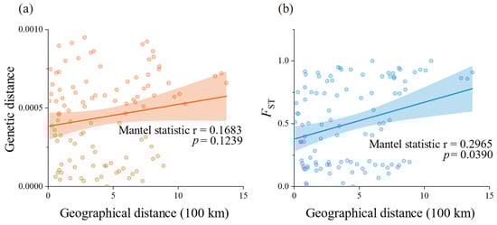 Mantel test of pairwise genetic distance and pairwise FST values with geographical distance among populations, respectively. The shadow of linear regression represents the 95% confidence interval.