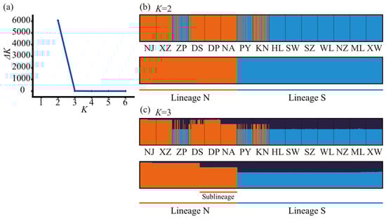 (a) Distribution of ΔK in populations’ genetic structure analysis based on cox3–cox1–rbcL concatenated sequences. Q value assignments of individuals under (b) K = 2 and (c) K = 3, organized by sampling populations and lineages.