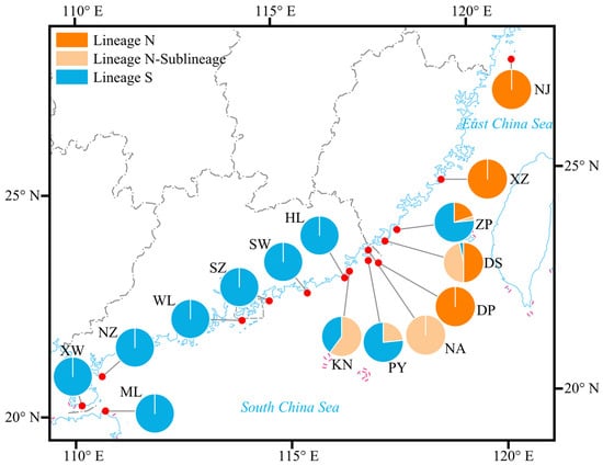 Using the cox3–cox1–rbcL concatenated sequence data from all individuals, a structure analysis of genetic lineage structure was conducted. The results indicated that the optimal number of genetic clusters was 2, suggesting the presence of two hypothetical ancestral populations, as the ΔK value reached its maximum at K = 2 (Figure 5a). The genetic assignments of individuals under K = 2, represented by two colors, is shown in Figure 5b. Based on the composition of genetic assignments, all individuals could be classified into two lineages, which exhibited a north–south geographical distribution (Figure 6). These lineages were labeled as Lineage N and Lineage S, respectively. The two lineages showed distinct differences, with predominantly pure genetic origins and only a minor admixture from their hypothetical ancestral sources (Figure 5b). Among the 15 populations, all individuals from the relatively northern populations—Nanji (NJ), Xiaozuo (XZ), Dingpeng (DP), and Nan’ao (NA)—were assigned to Lineage N. In contrast, all individuals from the relatively southern populations—Huilai (HL), Shanwei (SW), Shenzhen (SZ), Wailingding (WL), Naozhou (NZ), Mulang Bay (ML), and Xuwen (XW)—were assigned to Lineage S. The four populations located in the southern Fujian-eastern Guangdong region—Zhangpu (ZP), Dongshan (DS), Pingyu (PY), and Keniaowei (KN)—exhibited an admixture of both lineages (Figure 5b and Figure 6). An AMOVA of the two lineages revealed that the genetic variation between lineages accounted for 79.22% of the total variation (ΦST = 0.79218, p < 0.001), indicating significant differentiation between the two lineages (Table 2).