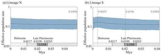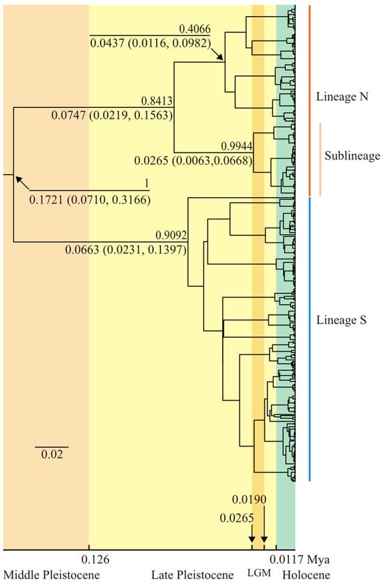 Using the cox3, cox1, and rbcL sequence data from all 450 individuals, a calibrated gene tree was generated under the conditions of the average mutation rates for each sequence, the best nucleotide substitution models (cox3: HKY model; cox1: HKY model; rbcL: F81 model), and a Bayesian skyline tree prior model, as shown in Figure 7. The structure of the calibrated gene tree indicates that all individuals cluster into two clades with high support, with posterior probabilities of 84.1% and 90.9%, respectively. This suggests that all individuals can be divided into two lineages, which is consistent with the lineage division results from the aforementioned structure analysis. The divergence time between the two lineages is estimated to be 0.1721 Mya (million years ago) (95% HPD confidence interval: 0.0710–0.3166 Mya). The time to most recent common ancestor (TMRCA) for Lineage N is estimated to be 0.0747 Mya (95% HPD confidence interval: 0.0219–0.1563 Mya), while the TMRCA for Lineage S is estimated to be 0.0663 Mya (95% HPD confidence interval: 0.0231–0.1397 Mya). Within Lineage N, a highly supported subclade with a posterior probability of 99.44% indicates the presence of a sublineage differentiation. Similarly, in the structure analysis, when K = 3, the Q value assignment also revealed the existence of this sublineage (Figure 5c). The TMRCA for this sublineage is estimated to be 0.0265 Mya (95% HPD confidence interval: 0.0063–0.0668 Mya). In contrast, no highly supported subclades were formed within Lineage S, indicating a lack of significant genetic differentiation within this lineage.