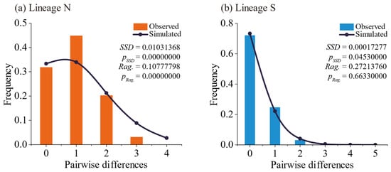 Neutrality tests were conducted on the two lineages based on the cox3–cox1–rbcL concatenated sequence data. The results showed that Lineage N exhibited non-significant negative values for both Tajima’s D and Fu’s FS (p > 0.1), while Lineage S displayed significantly negative values for both statistics (p < 0.001) (Table 3). The neutrality test results suggest that Lineage N did not significantly deviate from the neutral evolution model, indicating that it may not have undergone demographic expansion. In contrast, Lineage S significantly deviated from the neutral model, suggesting a possible historical demographic expansion. Mismatch distribution analyses for the two lineages were performed using the cox3–cox1–rbcL concatenated sequence data under the spatial expansion model. The observed and simulated values are presented in Figure 8. For Lineage N, although the observed values showed a unimodal distribution, they did not match the simulated curve, and both the SSD and Rag. statistics were significant (pSSD = 0.0000, pRag. = 0.0000) (Figure 8a), rejecting the hypothesis of demographic expansion. For Lineage S, the observed values closely matched the simulated curve, with a significant SSD statistic (pSSD = 0.0453) but a non-significant Rag. statistic (pRag. = 0.6633) (Figure 8b), providing insufficient evidence to reject the demographic expansion hypothesis. This indicates that Lineage S may have undergone expansion. Bayesian skyline reconstruction was performed using the cox3, cox1, and rbcL sequence data to infer the historical effective population size changes of the two lineages over time (Figure 9). For Lineage N, the effective population size remained nearly stable from approximately 48.0 kya (thousand years ago) onward, showing no significant trend of demographic expansion (Figure 9a). In contrast, Lineage S exhibited an initial expansion followed by a decline in effective population size starting around 40.4 kya. The demographic expansion began approximately 19.6 kya, followed by a demographic decline around 2.9 kya (Figure 9b). The Bayesian skyline reconstruction results are consistent with the conclusions drawn from the neutrality tests and mismatch distribution analyses, supporting the inferred historical demographic dynamics of the two lineages.
