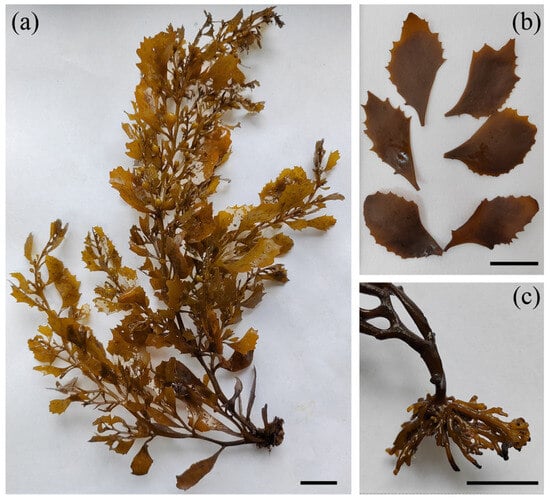 Sargassum hemiphyllum var. chinense: (a) Entire thallus; (b) leaves with truncated apex; and (c) holdfast composed of branched cylindrical rhizoids. Scale bars each represent 2 cm.